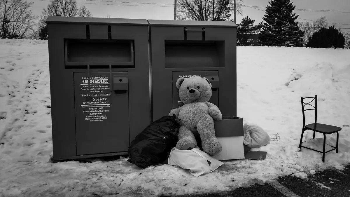 A black and white photo of a large teddy bear sitting on some garbage bags in front of a couple of charity donation bins. There is snow covering the ground and a single, old dining chair sits alone, off to the side.