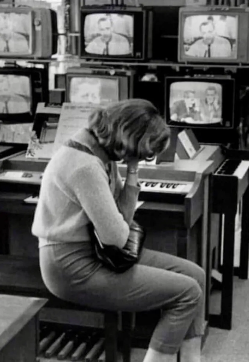 ThoughtA distraught woman in Sears Department Store on November 22nd 1963 watching live coverage of the aftermath of President John F. Kennedy’s assassination.