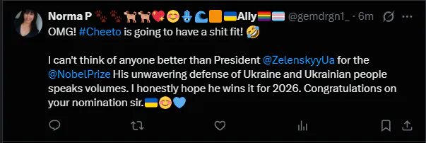 Congrats to our friend, President Zelenskyy for formally being nominated for a more than well-deserved prize that is way out of reach for those painted orange.