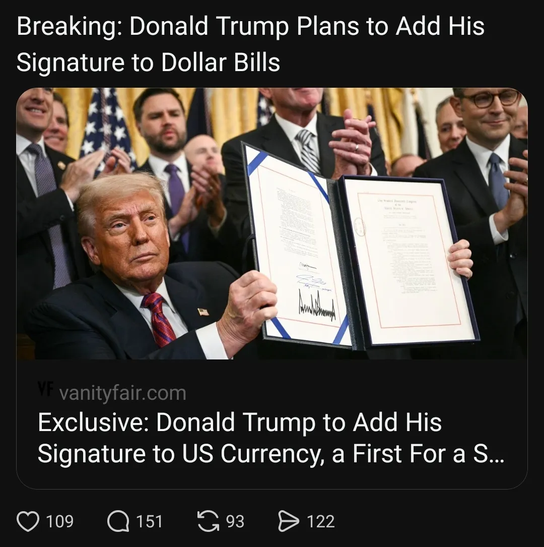 To all future bills of all denominations. The one dollar bill, the five dollar bill, the twenty dollar bill. The 100 dollar bill. Egomaniac Tyrant