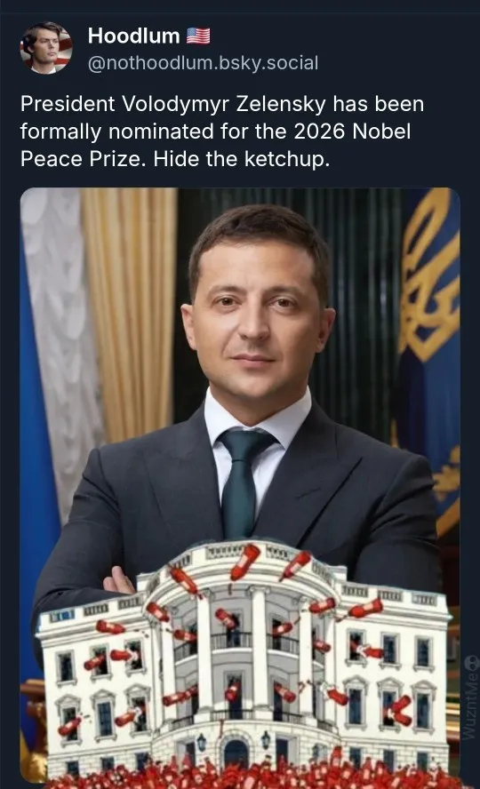 President Volodymyr Zelensky has been formally nominated for the 2026 Nobel Peace Prize. Hide the ketchup.